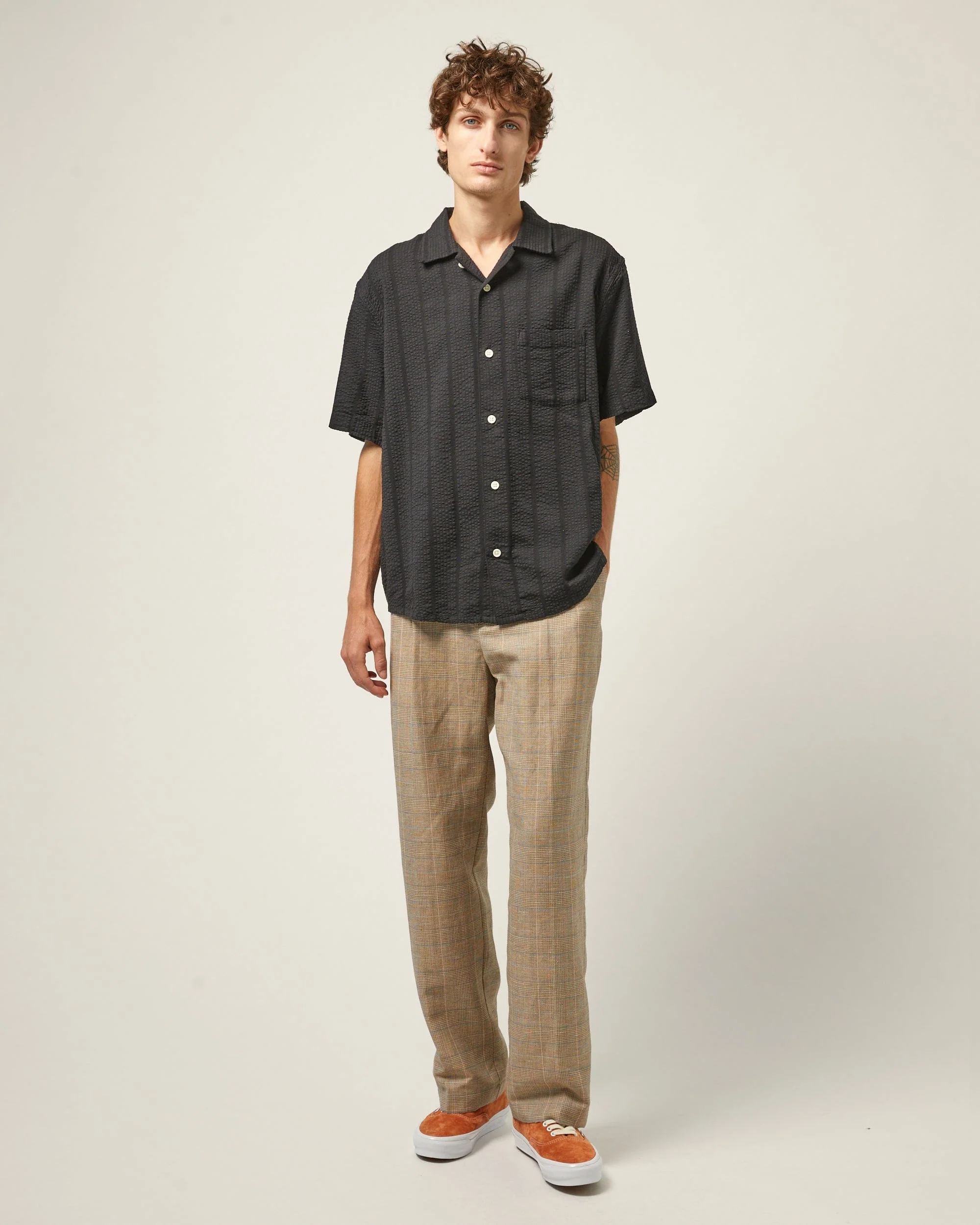 Soft, airy, and summer-ready. This short-sleeve button-up is cut from a breezy cotton-viscose seersucker blend that practically floats off the skin. Finished with a camp collar and natural corozo buttons, it’s laid-back without looking lazy.